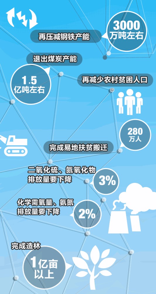 去產(chǎn)能:再壓減鋼鐵產(chǎn)能3000萬噸左右,退出煤炭產(chǎn)能1.5億噸左右。